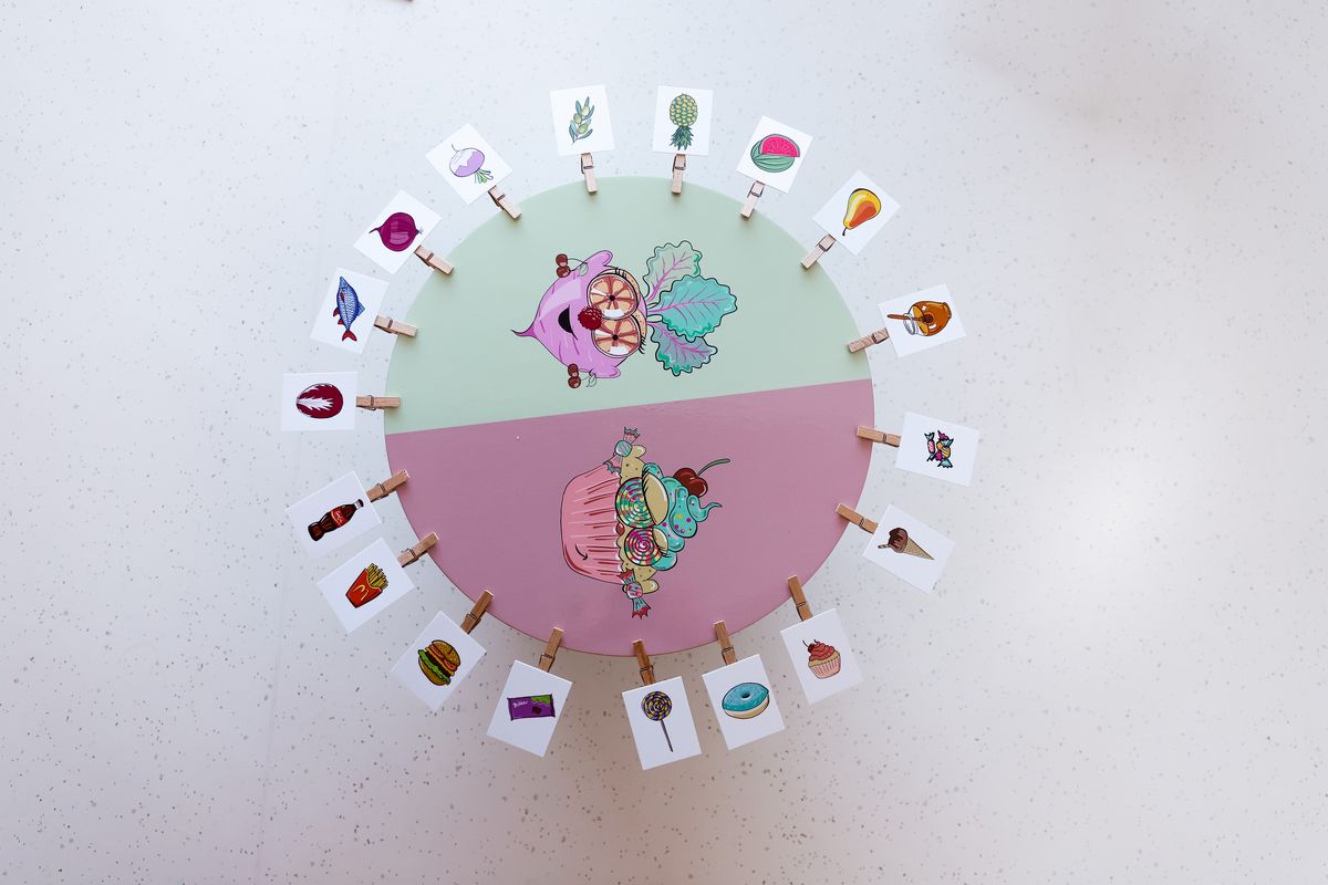 Prejmejo kar 77 sličic, ki jih morajo razvrstiti na ustrezna mesta. Nezdravo živilo sodi v del kroga z žalostnim obrazkom – če pojemo tega preveč, nam bo slabo in bo slabo vplivalo na naše zdravje. Zdravo živilo pa sodi v polje z nasmejanim obrazkom – saj nam ta živila prinašajo vitamine in minerale, ki nas varujejo pred boleznimi.